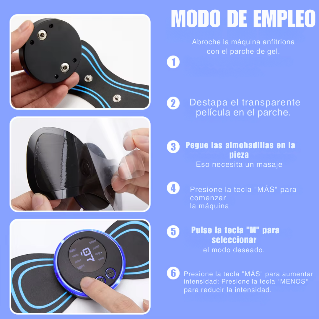 Para usar el Mini Multimasajeador, primero asegúrate de que la piel esté limpia y seca. Luego, retira la protección del gel adhesivo y coloca el dispositivo en la zona y listo.